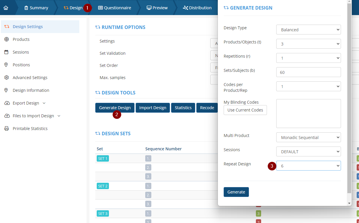 Step 1. Generate a design with multiple sessions by clicking on Design (1)>Generate Design (2)>Repeat Design (3). In the example below, a design that will be repeated six times is created. This means that each product will be evaluated six times.