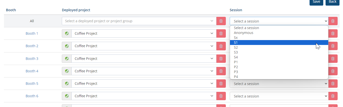 - Allocate your project to all booths in this room, or to one booth. Select your project in the drop-down list behind ALL.