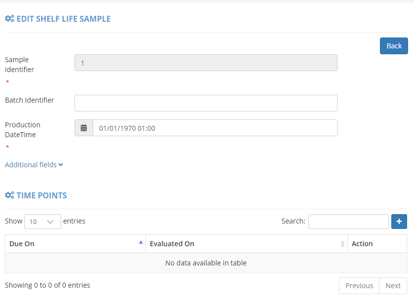 Step 2. Once the product is selected, you can add information regarding the product production and a Batch and Sample Identifier. In the Time Points section is possible to add the information regarding the time interval that the product will be tested.