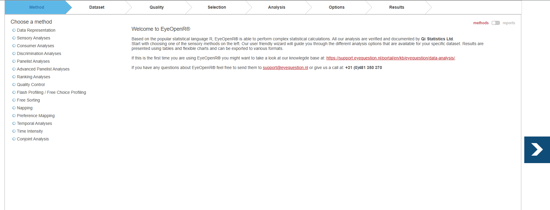 After selecting the desired method or report, click the blue arrow to move further to the next screen.